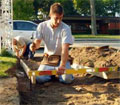 11. Use a groover to make contraction joints in the fresh concrete. Make sure the groove depth is one-fourth of the slab thickness. As an option, saw the joints using either an early-cut saw or a conventional saw. Early jointing helps prevent cracking.