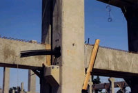In pretensioning, the steel is stretched before the concrete is placed. High-strength steel tendons are placed between two abutments and stretched to 70 to 80 percent of their ultimate strength. Concrete is poured into molds around the tendons and allowed to cure. Once the concrete reaches the required strength, the stretching forces are released. As the steel reacts to regain its original length, the tensile stresses are translated into a compressive stress in the concrete. Typical products for pretensioned concrete are roof slabs, piles, poles, bridge girders, wall panels, and railroad ties.